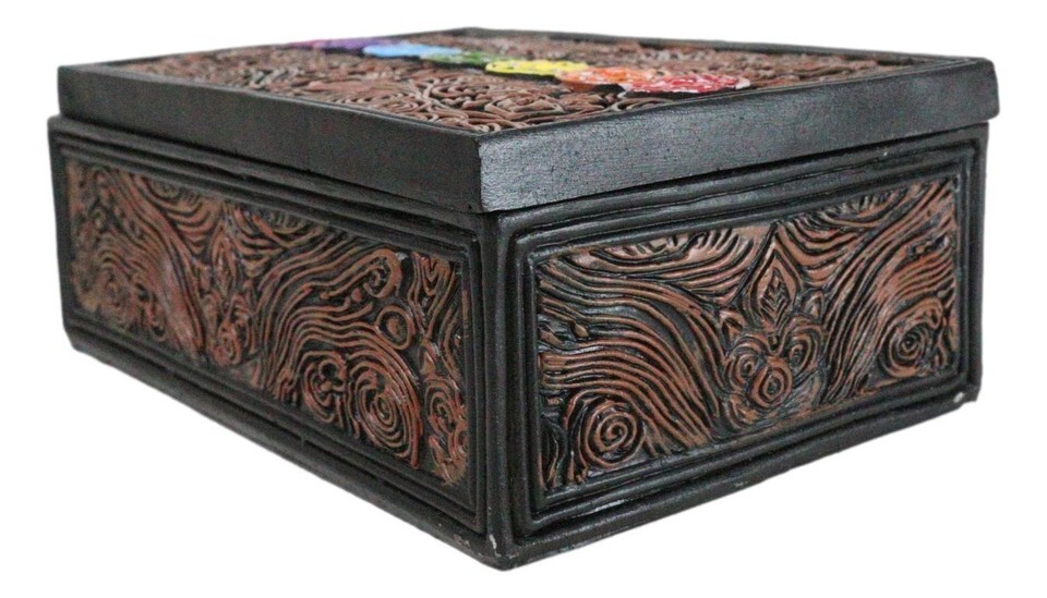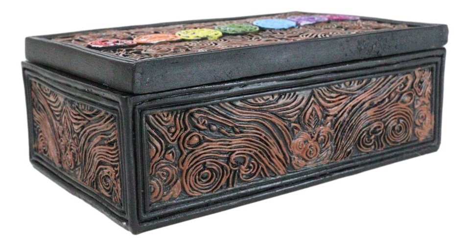 ? This metaphysical chakra sculptural tarot card box with lid is made of polyresin, hand painted and polished individually.