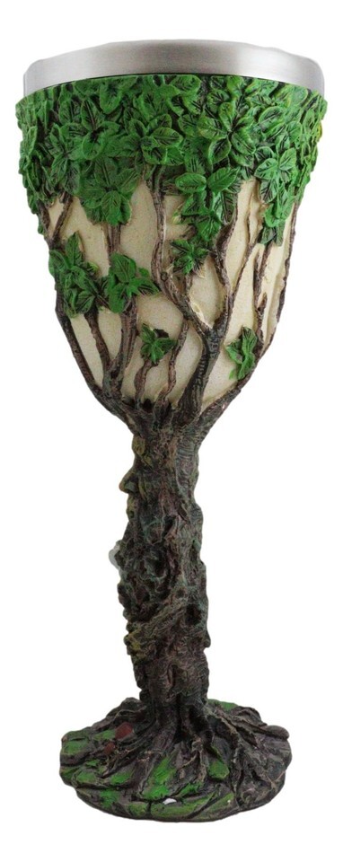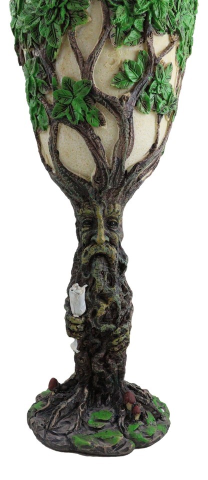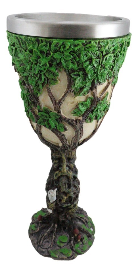 ? Drink in style with this cool greenman goblet. This forest willow spirit greenman forms the stem handle of the wine goblet with his system of roots and thriving bark trunk. The mystical greenman supports the chalice cup with a vast network of branches and green leaves, creating a lush Tree Of Life.