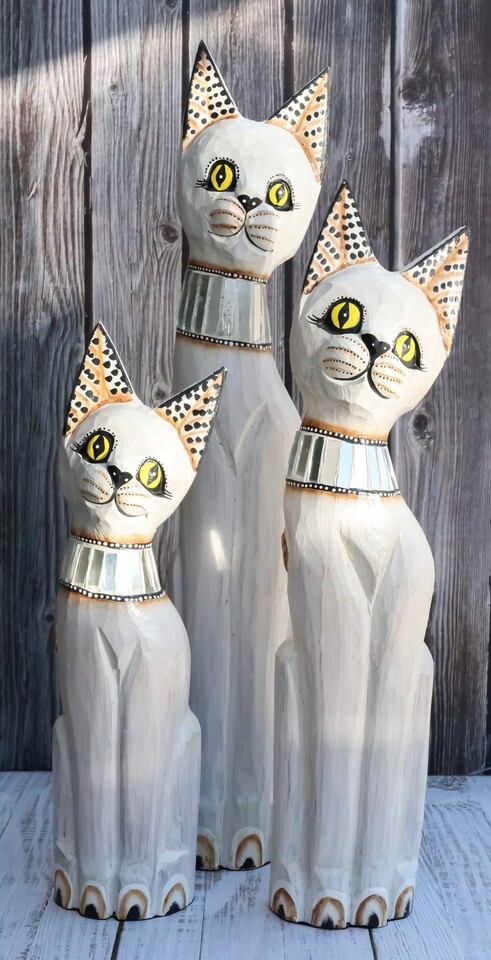 These cats are made of Albesia wood, hand painted and polished individually. Because each figurine is hand carved (handicraft) and crafted out of natural wood, some variations in design and finish are a norm.