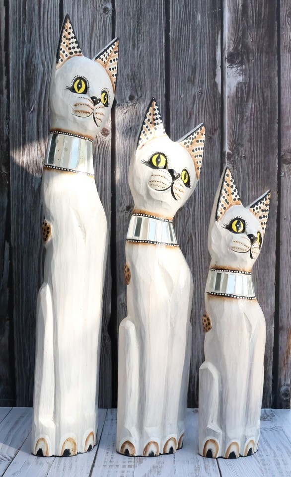 These adorable cats are hand carved out of albesia wood, dried in a furnace kiln before being polished and painted individually by our expert artisans. These adorable cats are adorned with glass fragments that go around the neck like an accessory. They are packed in 3 different heights. They make perfect lively decorations for your home or what have you!