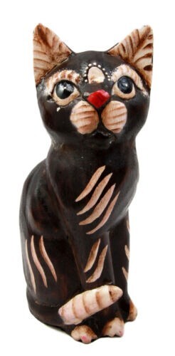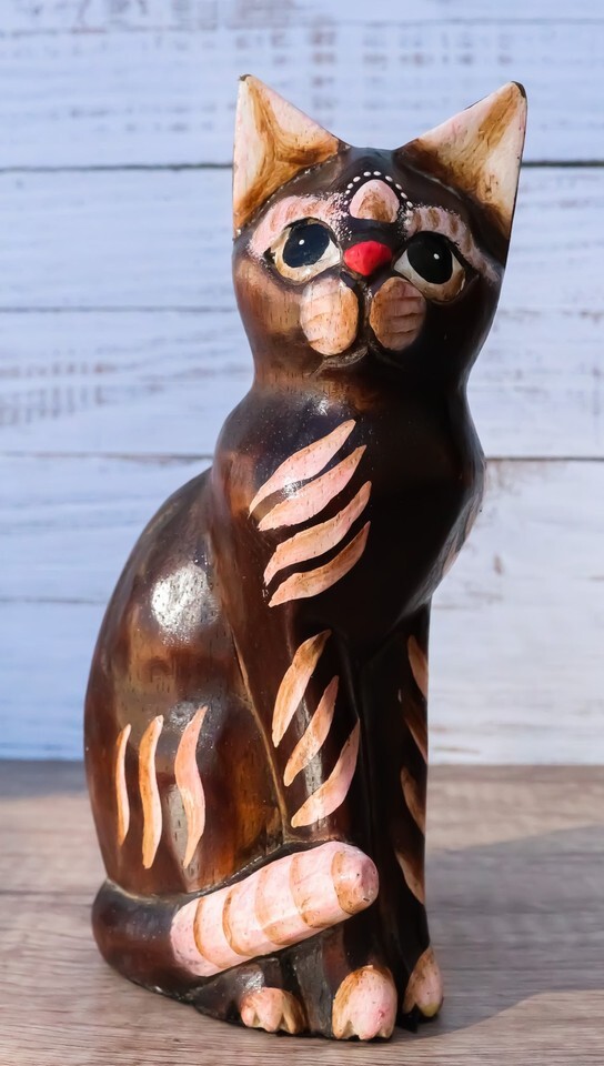 This cat is made of Albesia wood, hand painted and polished individually. Because each figurine is hand carved (handicraft) and crafted out of natural wood, some variations in design and finish are a norm.
