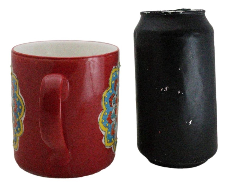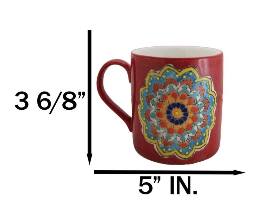 ? This mandala mug measures 3.75" High, 5" Long and 3.5" Deep approximately. The cup holds about 14 fluid ounces. Microwave and Dishwasher Safe.