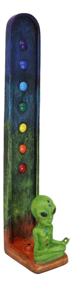? The Roswell Alien Upright Incense Holder has the chakra colors for the zones of realization. The alien sits at the base as the symbols rise above it.