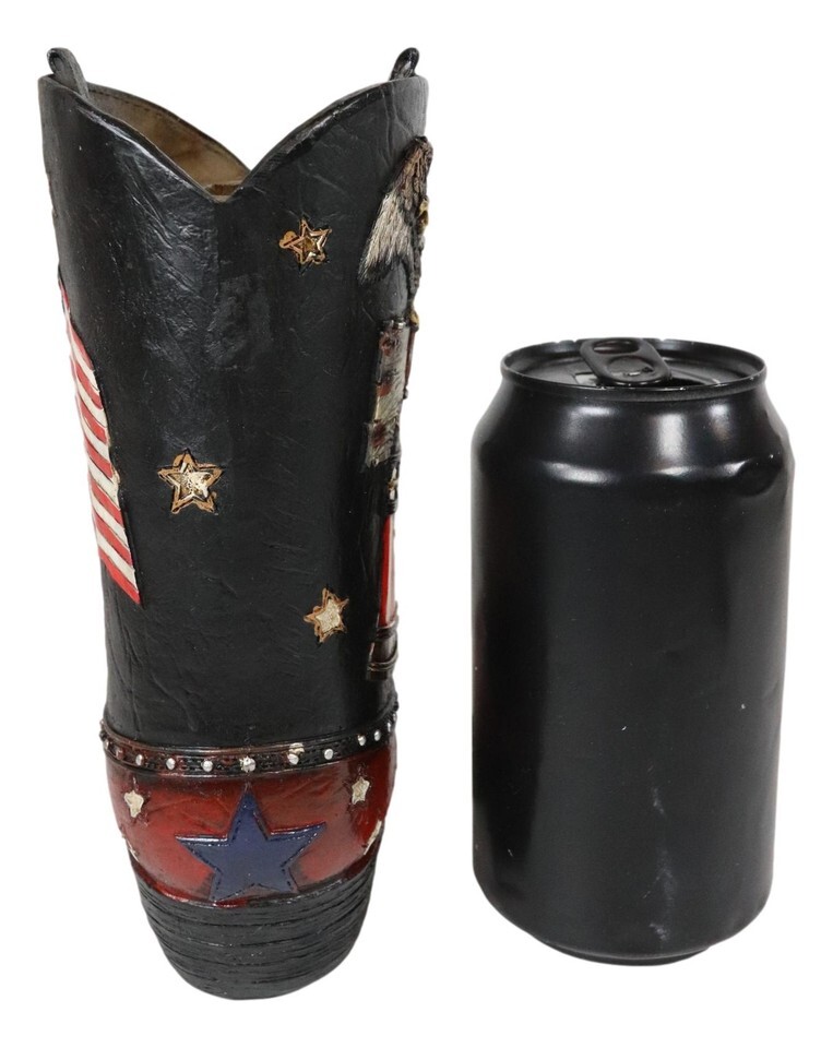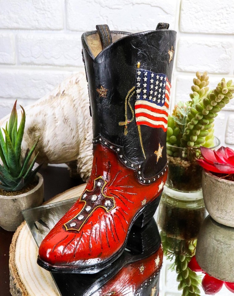 ? This exotic boot is designed with beautiful patriotic accent colors on black and red tooled leather finish. This ornate boot is decorated with silver studs like the stars in a dark sky, giving focus to the iconic eagle liberty bell and American flag. An inspirational cross is set against the red base part of the boot for a dramatic finish. It is perfect as a sculptural decor and as a money bank.