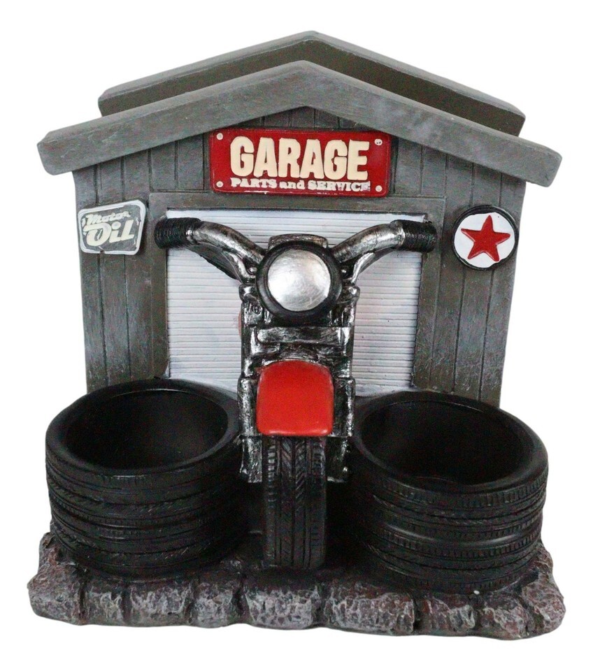 ? The sculpture features a wooden shed garage shop with the sign 'Garage Parts And Services'. The front end of a retro red chopper bike emerges from the garage door in 3D, accompanied by 2 tire stacks to hold your glass shakers. A very acceptable gift for that loved one on your Christmas shopping list who absolutely loves chopper bikes and automotives.