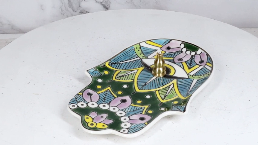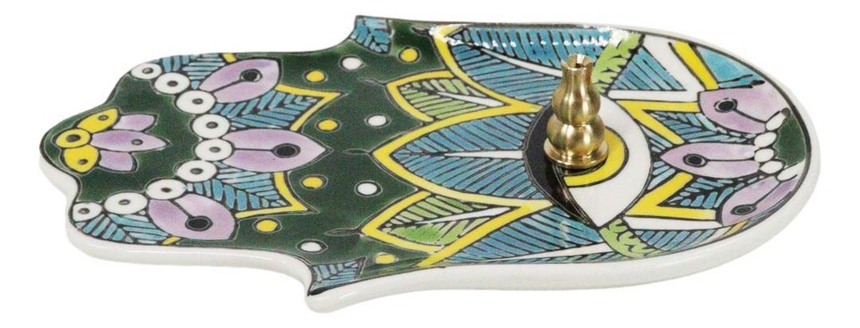 ? This Hamsa Palm With Eye Of Providence Incense Holder is made of ceramic, individually hand painted and polished.