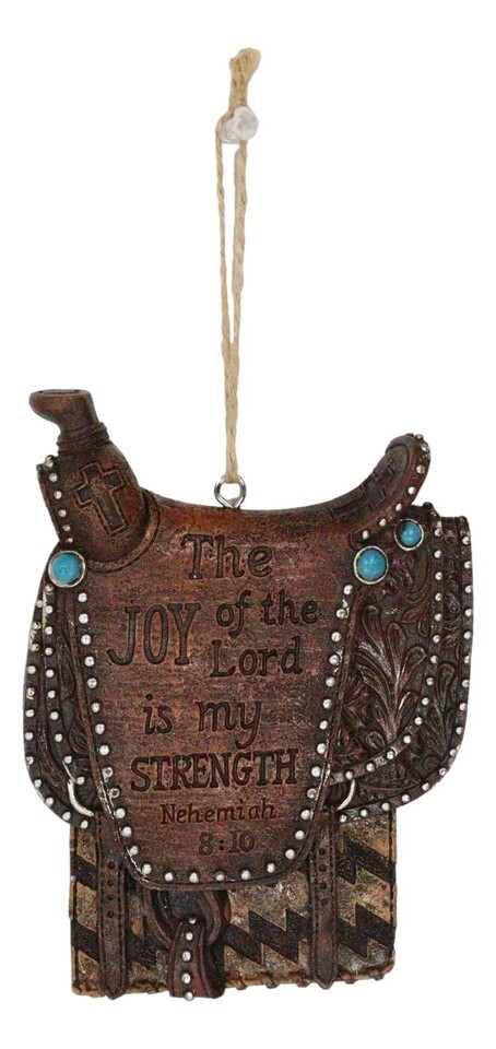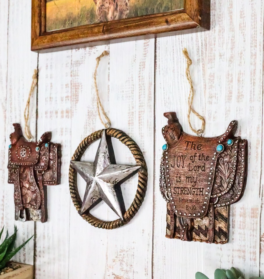 ? Turn your faith into a beautiful expression in your home with these ornamental accents. Intricately crafted faux tooled leather horse saddles are adorned with turquoise and silver beads, and carved with floral accents. Holy Scriptures are also imprinted on one of the saddles. The western star circle is iconic, encircled by braided ropes to add some cowboy flair.