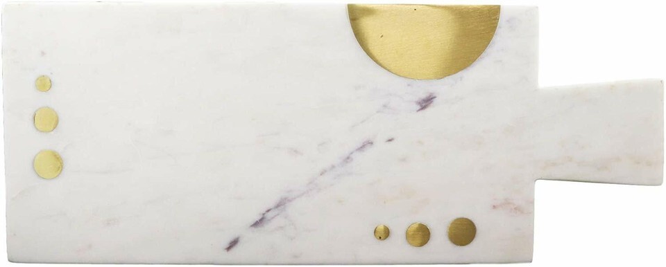 ? Your carefully-crafted hors d'oeuvres deserve a worthy canvas that matches their artistry. This versatile tray is crafted from solid white marble, decorated with inlaid brass accents for a subtle sense of glamour.