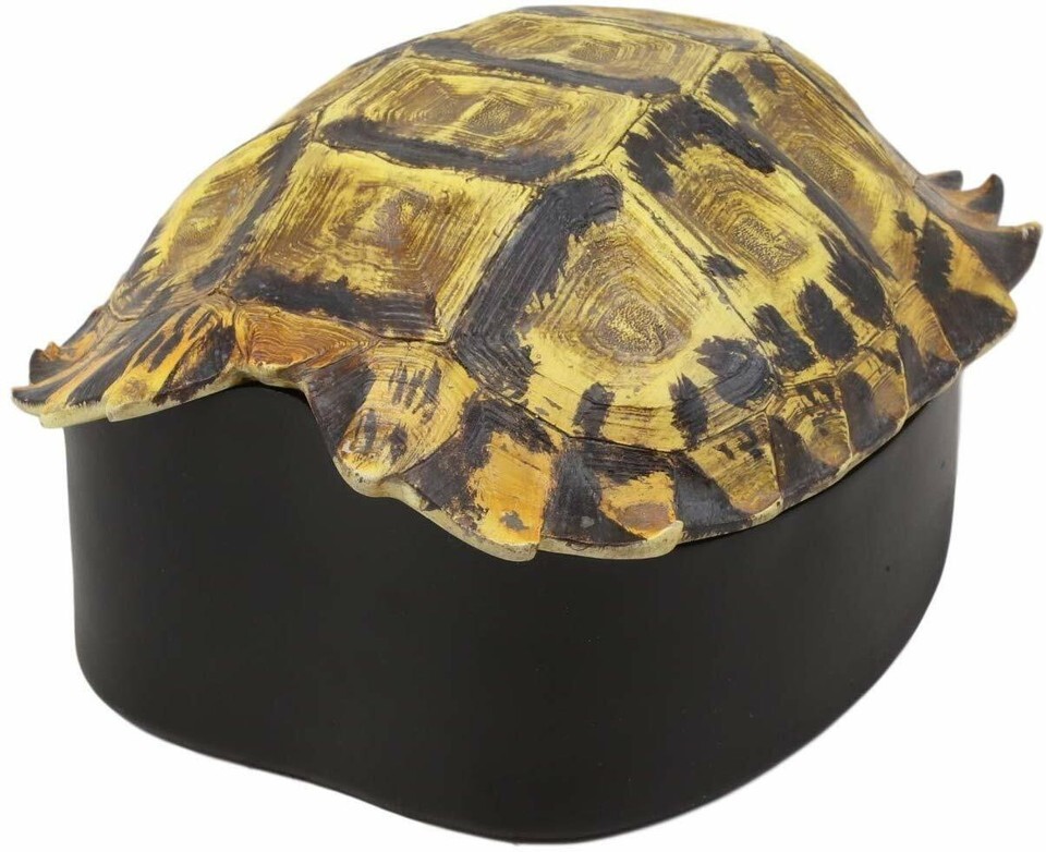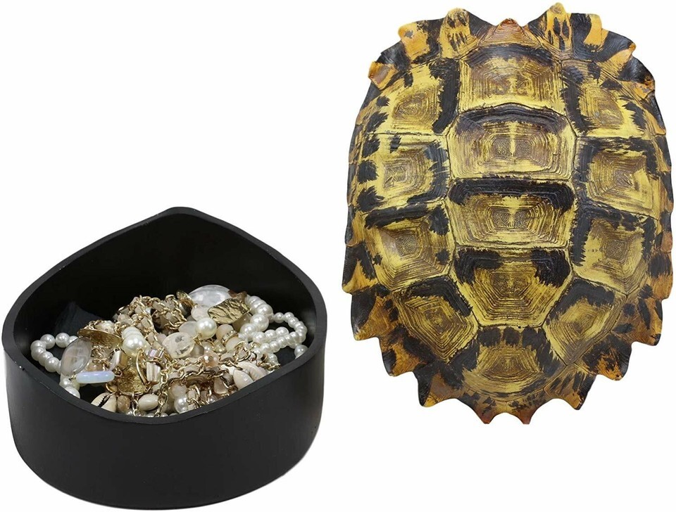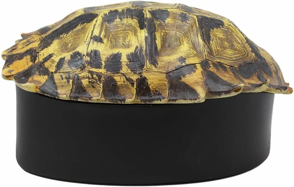 ? This beautiful rendition of the elongated tortoise shell is cast in resin medium, hand painted in colorful tones of yellow, brown and black. The turtle shell sets on top of a black oval shaped base that serves as a stash/jewelry box where you can store small stationery, jewelry, keys and other articles in your home. The quality and craftsmanship of the tortoise shell accent box is superb.