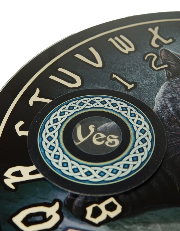 ? Printed on glass, the artwork depicts a black cat leaning onto a table with multiple tarot cards. The cat has bright green eyes. The alphabet, the numbers 0 through 9, and the words HELLO, GOODBYE, YES, and NO appear in a circle to complete the spirit board. This item also comes with a planchette for spirit board readings.