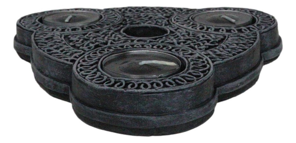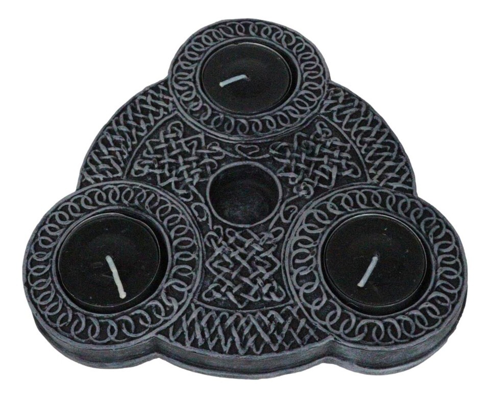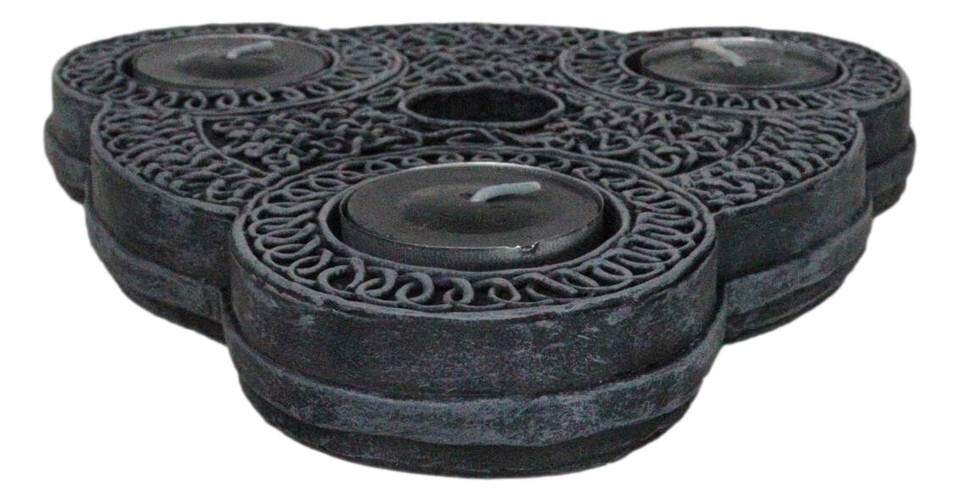 ? Elevate your spiritual rituals with our Triple Goddess Celtic Triquetra Candle Holders Sculpture. This enchanting sculpture holds 3 tea light votives and a single taper candle holder at the center, each intricately adorned with the sacred Triple Goddess symbol, representing the Maiden, Mother, and Crone. The elegant knotwork and triadic patterns not only enhance your altar but also infuse your space with a sense of timeless mysticism.