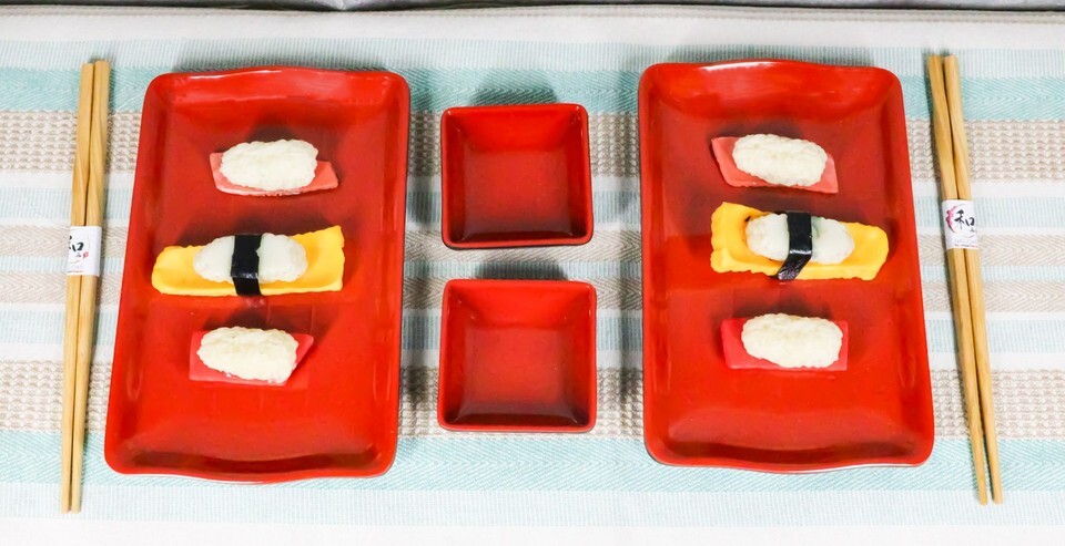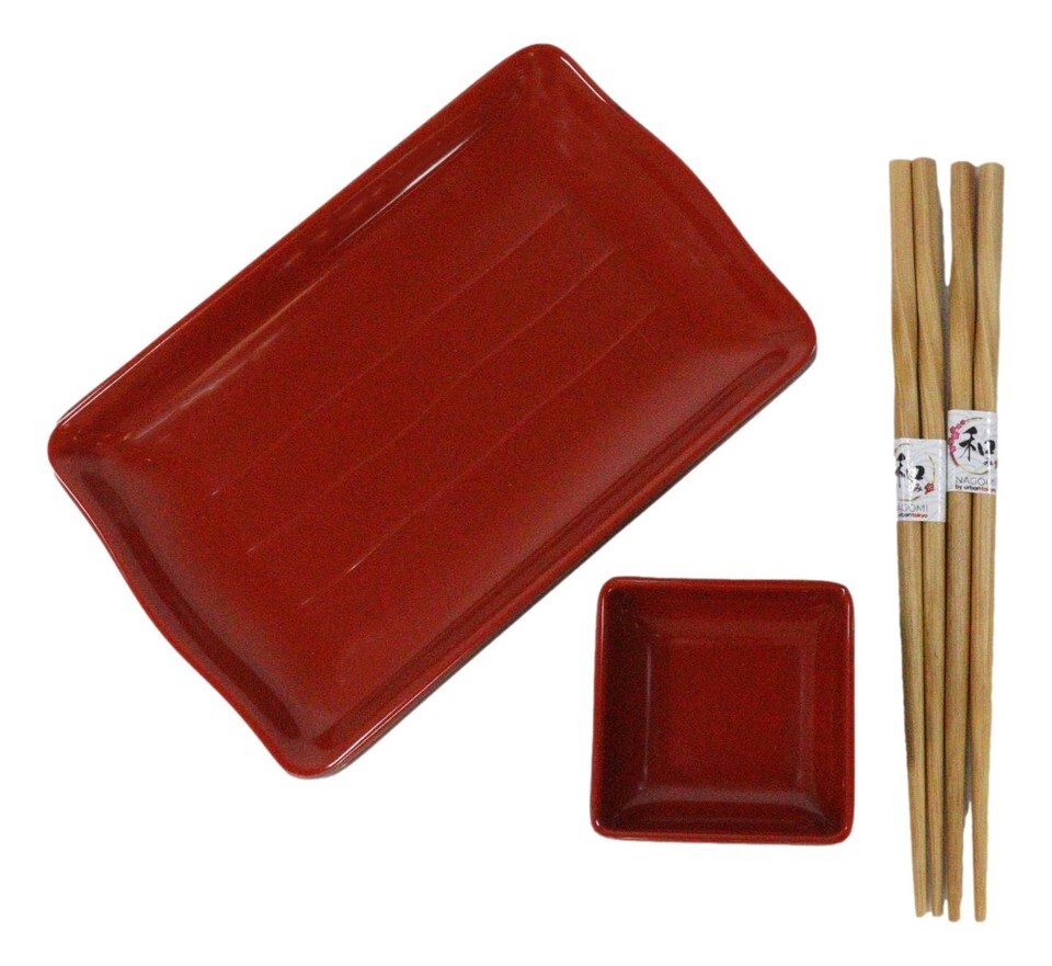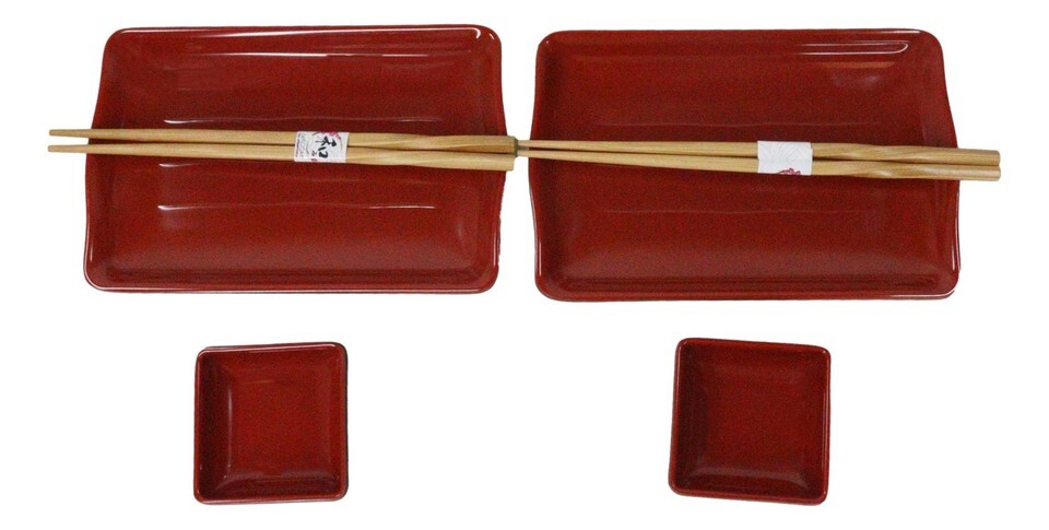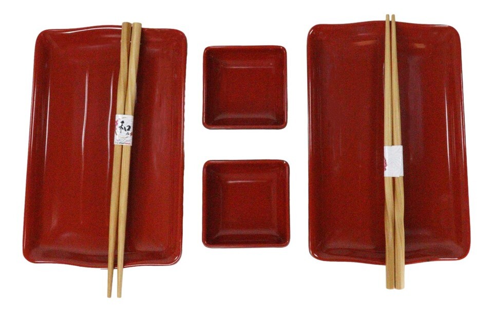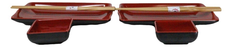 ? This Red And Black Dinnerware Sushi Set is made of high quality melamine in a state of the art factory in China. The sushi set includes 2 wavy rectangular plates, 2 pairs of chopsticks and 2 sauce dishes.