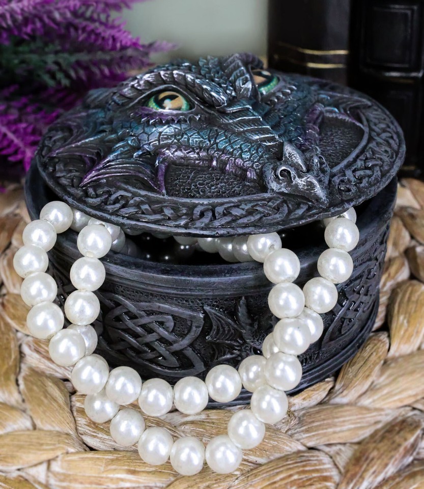 ? Never look a dragon in the eyes! Said to have been originally plucked from a Gothic dragon, our dragon head has been meticulously fashioned into a collectible box for your most treasured objects. Sculpted in exquisite detail and encircled by images of Celtic knotwork. The lid of this finished work lifts to keep your treasures safe in the sculpted interior. The eyes of dragon are designed to roll within its glass frame as if the dragon is alive inside!