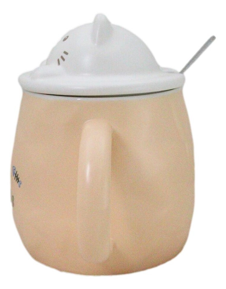 Whimsical Orange Chubby Feline Kitty Cat Cup Mug With Lid And Stirring Spoon