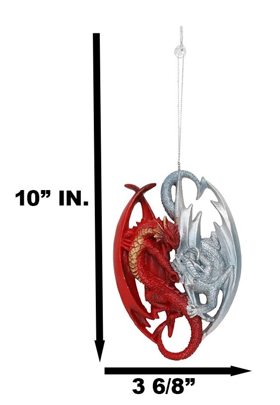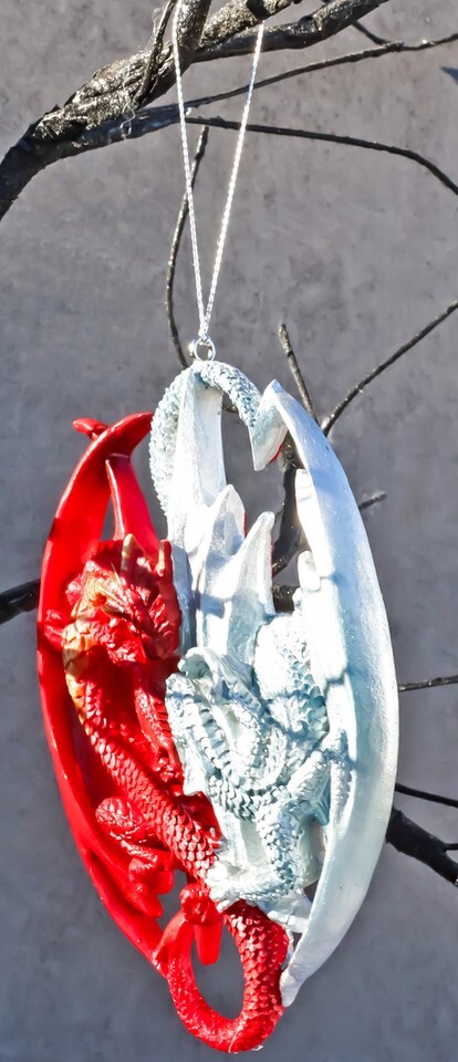 ? A striking pair of dragons for your home! This ornament can be hung on the Christmas tree, or anywhere else you choose, and doesn't need to be seasonal! It shows off a fiery red dragon playfully engaging with a shining silver-white dragon. The pair make for a magical gift idea!