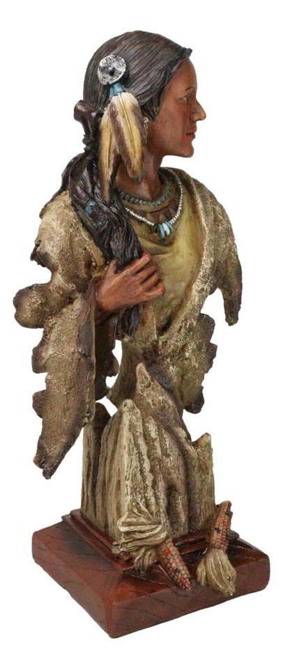 ? Introducing the Tribal Native American Indian Lady Princess Bust Figurine, a beautifully crafted piece that honors the grace and heritage of Native American culture. This exquisite figurine features a regal lady princess adorned with eagle feathers, symbolizing strength and spiritual connection. Her detailed attire includes traditional jewelry necklaces, representing prosperity and sustenance. Several maize pieces are scattered at the base of the bust to add a hint of agriculture to the piece.