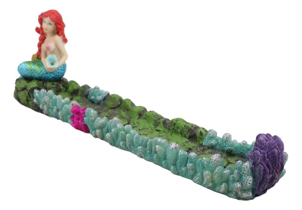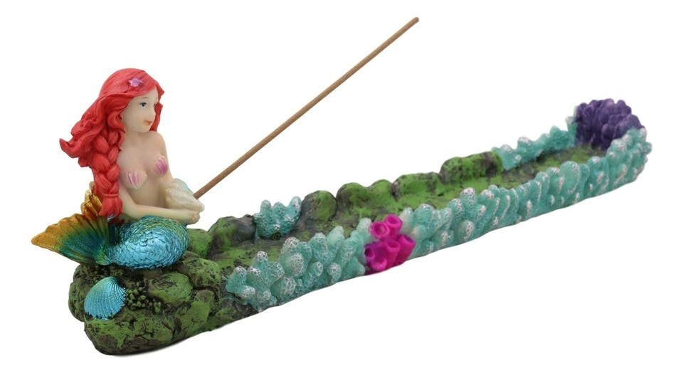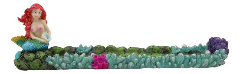 ? A beautiful mermaid will delight your eyes, while a stick of incense delights your nose! This fantastic incense burner features a redheaded siren of the sea, perched upon a bed of kelp and coral. Colorful and unique, it's a great addition to the home decor!