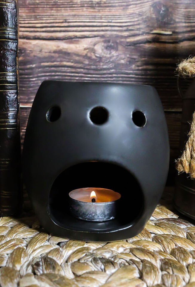 ? This ceramic skull oil burner is a unique way to melt your favorite wax melts and fragrance oils. The back of the skull has an opening to place the tealight candle, and three holes for ventilation. The light from the candle will illuminate the ventilation holes creating a soft backlight that enhances the entire item while in use. The soft glow of this light is excellent mood lighting, and elevates your space in a way that other oil burners can't.