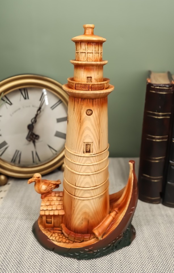 ? For many years, the lighthouse has been a symbol of inspiration and hope for many people. This nautical lighthouse in faux wood finish is the perfect decor for that vacation home or office of yours, whether by the sea or far inland. The spirit of the seas will come right along with this sculpture featuring a multi tiered floor structure with the light beacon at the top. The lighthouse rests on a boat deck with an oversized seagull perching on the roof on the house beneath.