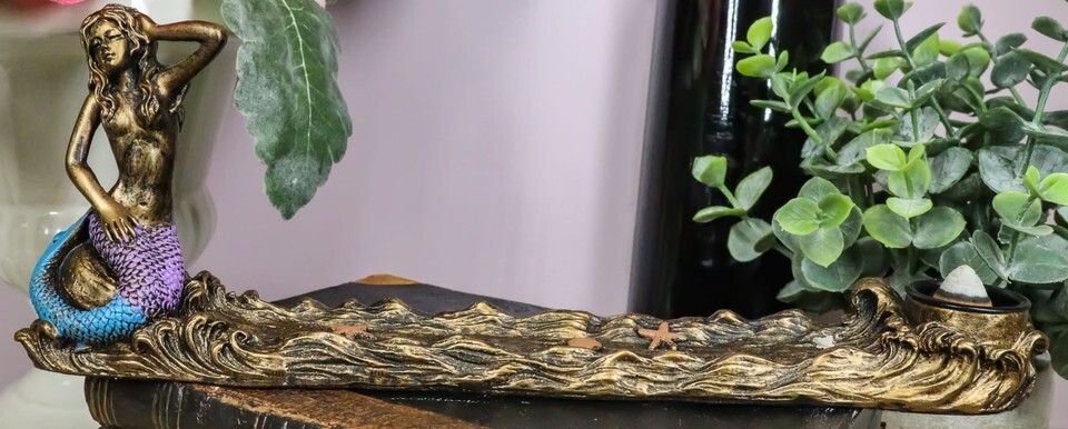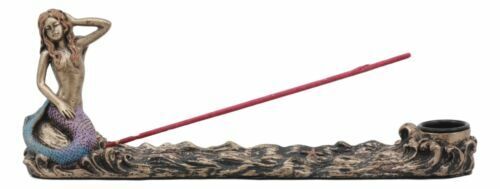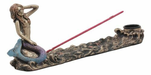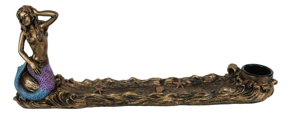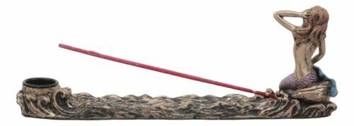 ? Crashing waves frame this mythical aquatic incense holder. A beautiful mermaid sits atop a rock under the warm tropical sun. Hand painted for a faux bronze finish, it holds both incense sticks and cones.