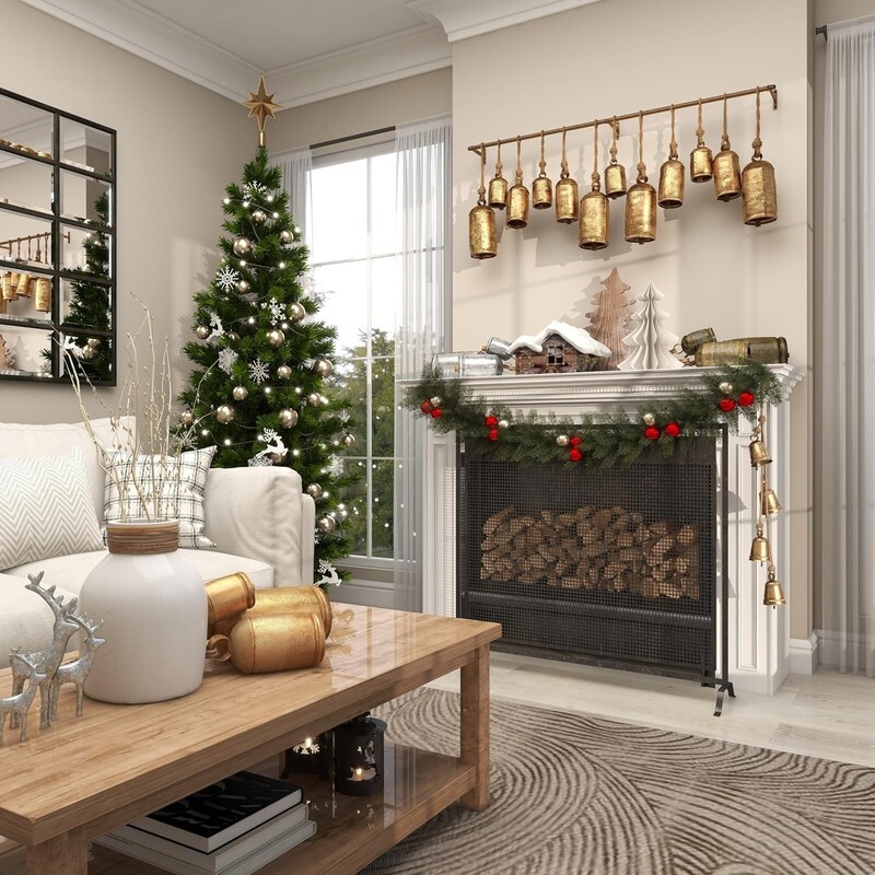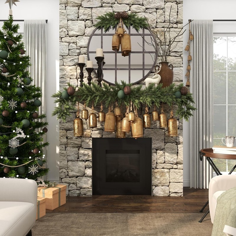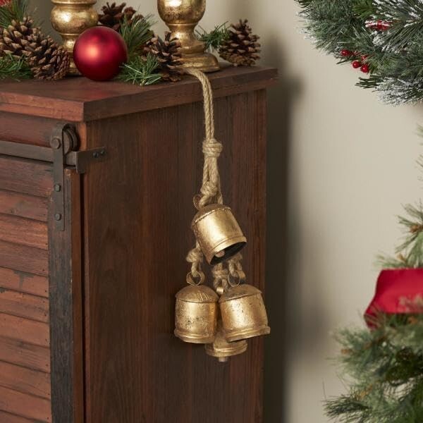 MEDIUM SIZE DECORATIVE BELLS FOR DOOR: The gold metal decorative cow bells measures 4L x 3W x 29H inches, and weighs 0.93 lbs