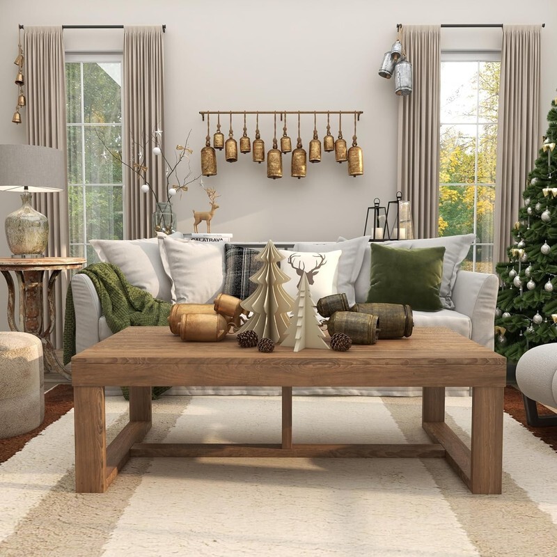 GOLD AND BROWN DECORATIVE BELLS FOR HOLIDAYS: Cylindrical bells hanging on a rope boast a satin gold finish, a brown jute rope, and brown wooden clappers, exuding rustic elegance