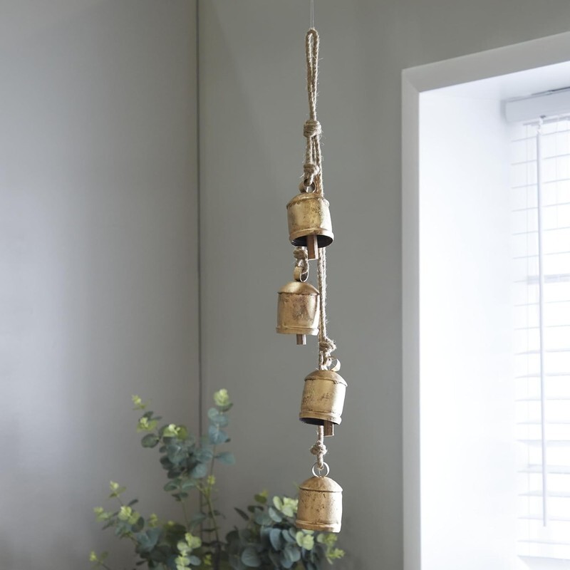 Create a sense of balance and depth in the most unique way by hanging these bells in empty spaces needing some extra love. Bell decor is stunning year round, but provides the added benefit of transitioning to holiday decor when the season is near. Add charming appeal to your home by hanging this gold meditation bell in a doorway or hallway corner, or kitchen for added visual flair. This item ships in 1 carton. There are 4 bells and each bells is 3"L x 3"W x 4"H. Metal decorative cow bells makes a great gift for any occasion. Can be hung vertically using the jute rope; nails and screws not included. Suitable for indoor use only. This item ships fully assembled in one piece. Made in India. This is a single gold colored meditation bell set. Bohemian style.