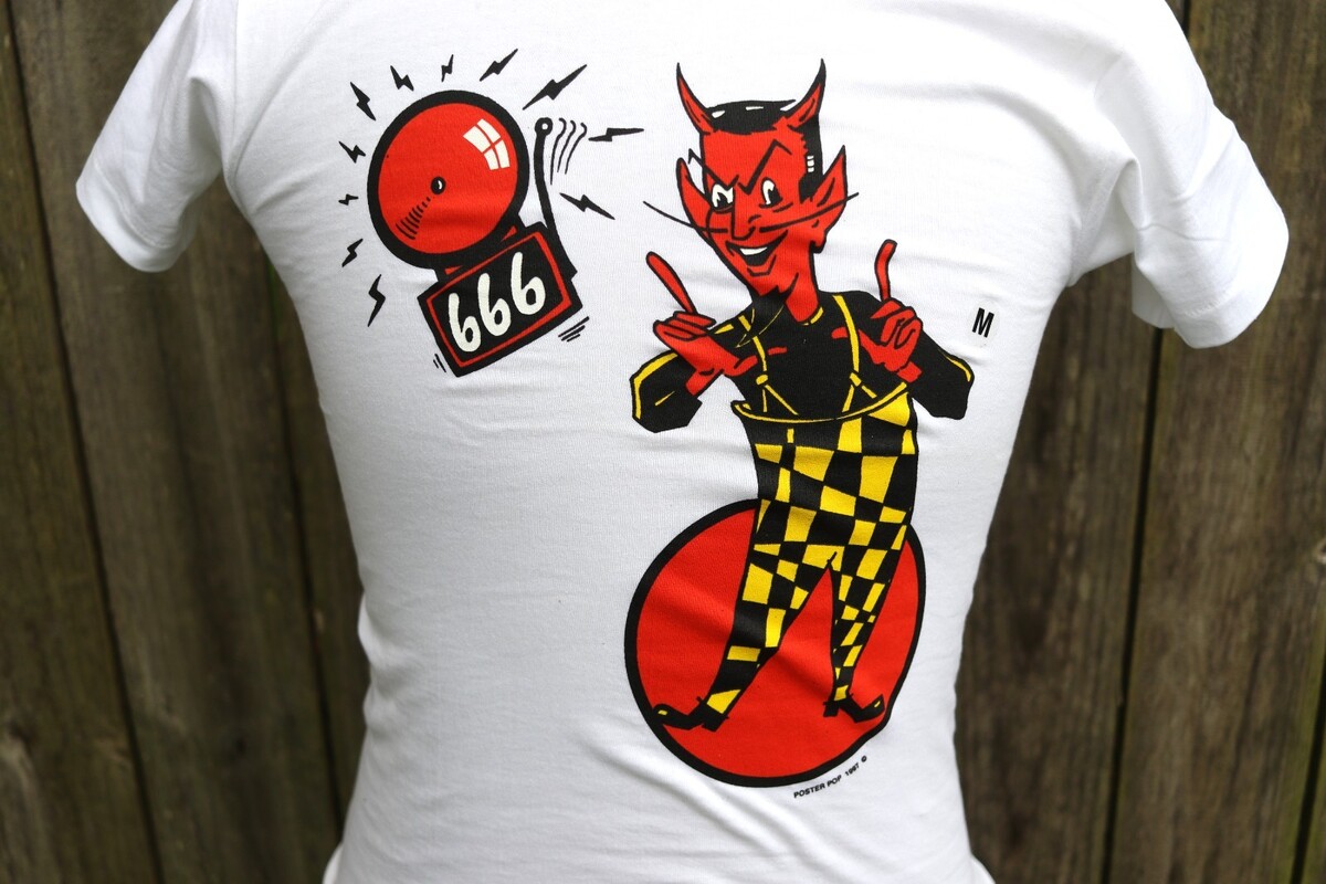 The Vintage NOS 1997 Poster Pop Devil Alarm Bell 666 T Shirt is a classic piece of men's clothing featuring a bold design. Made by Poster Pop, this multicolor T-shirt comes in multiple sizes for a comfortable fit. With short sleeves and a regular size type, this shirt is suitable for both men and women who appreciate retro fashion. Perfect for casual wear or as a collector's item, this unique tee is sure to make a statement with its eye-catching print.
