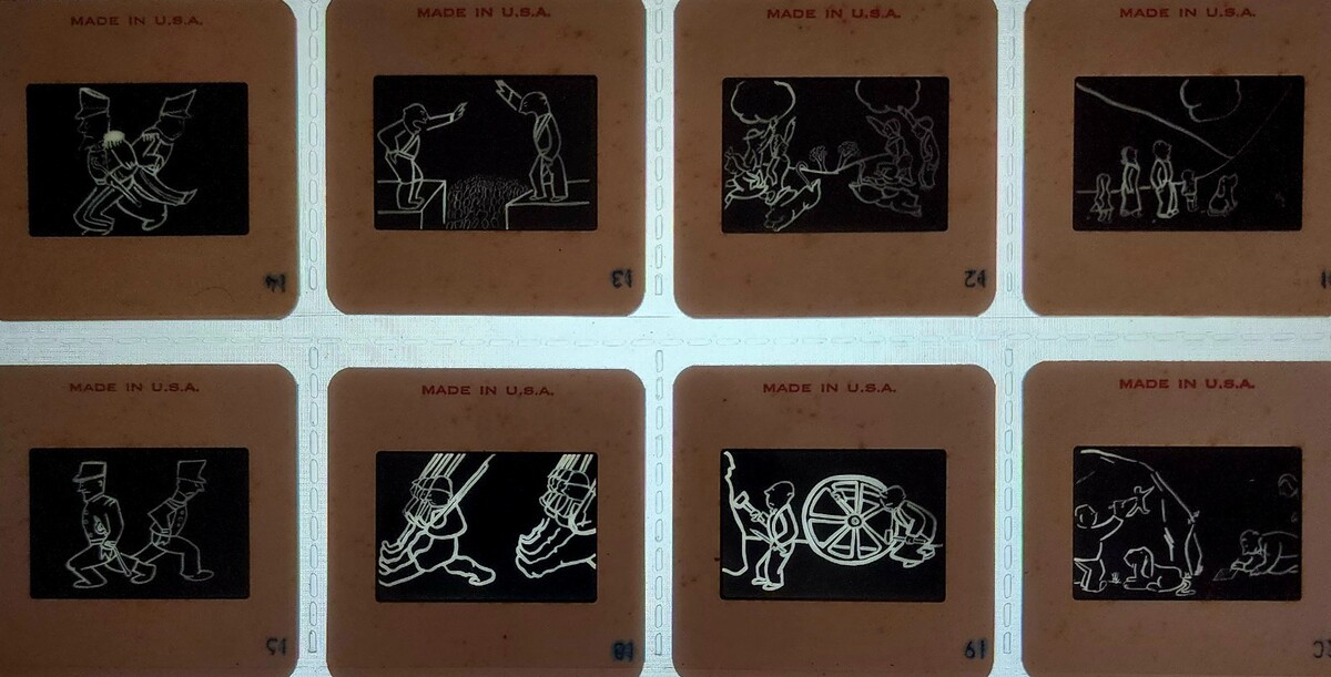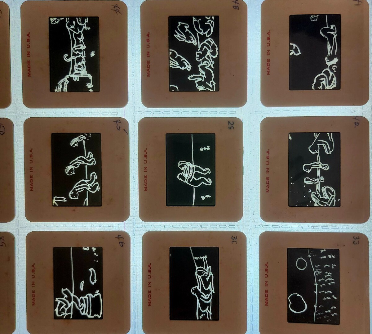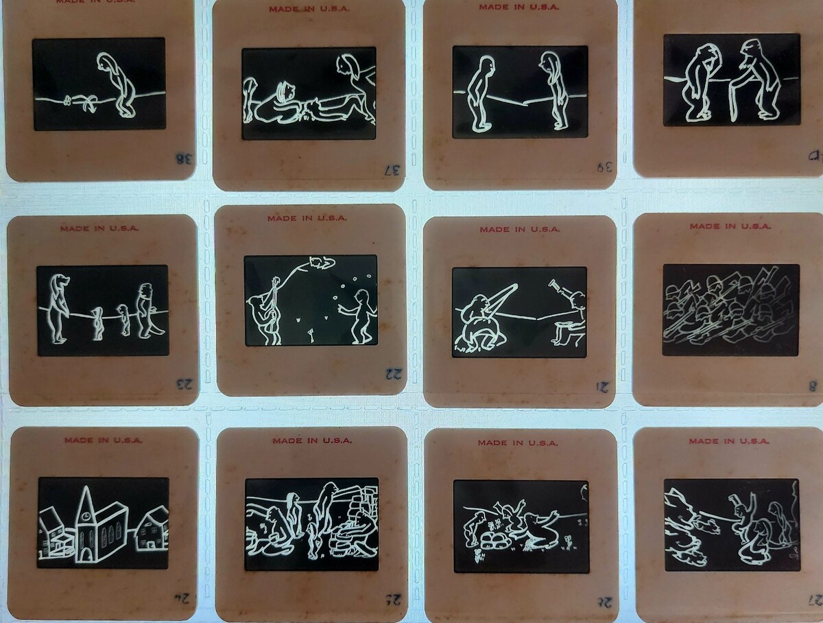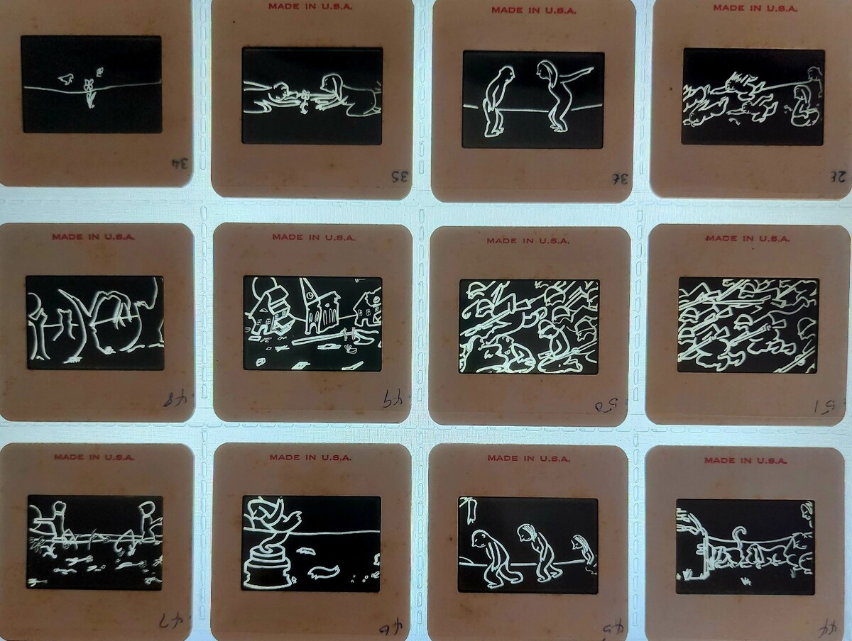 I was told that these were film slides of art done by Saul Steinberg...though I cannot verify this with 100% accuracy.