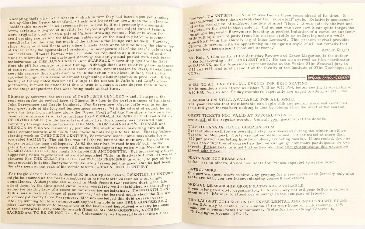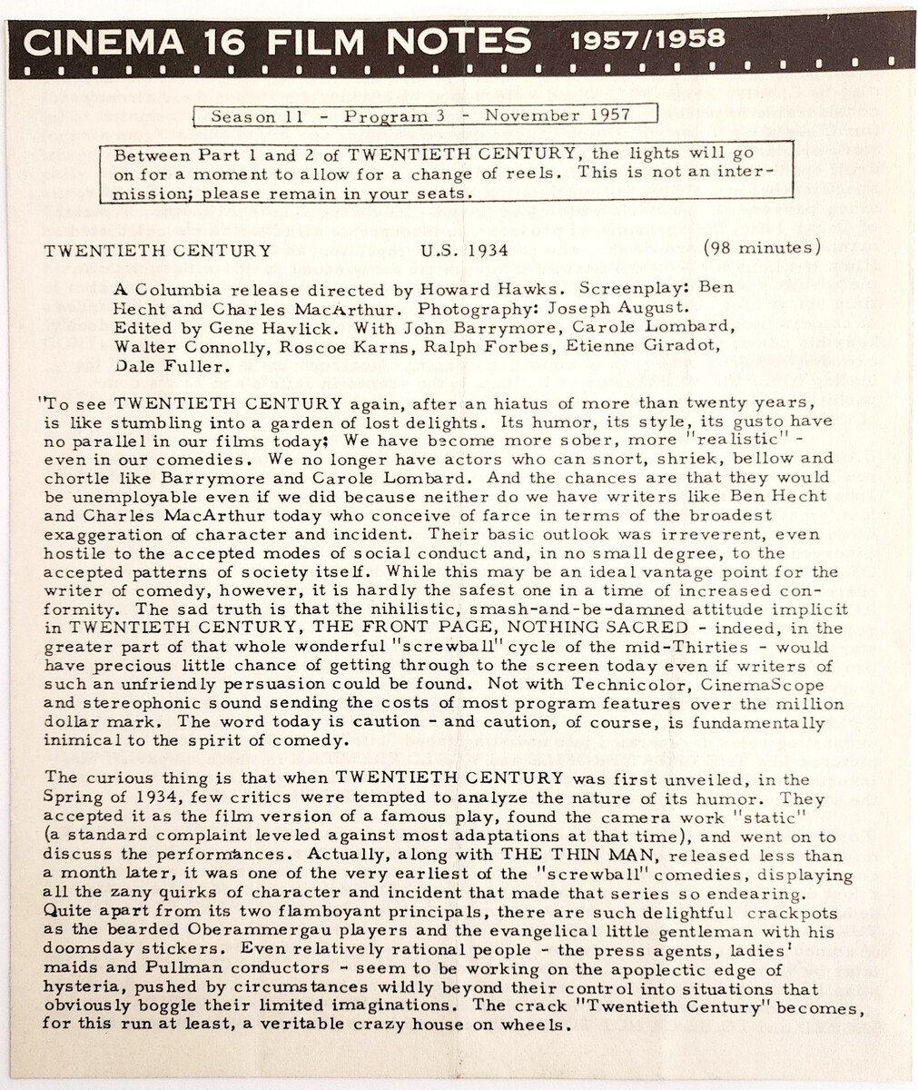 1957 Cinema 16 Film Notes Twentieth Century Hawks Season 11 Nov Original 2 C99