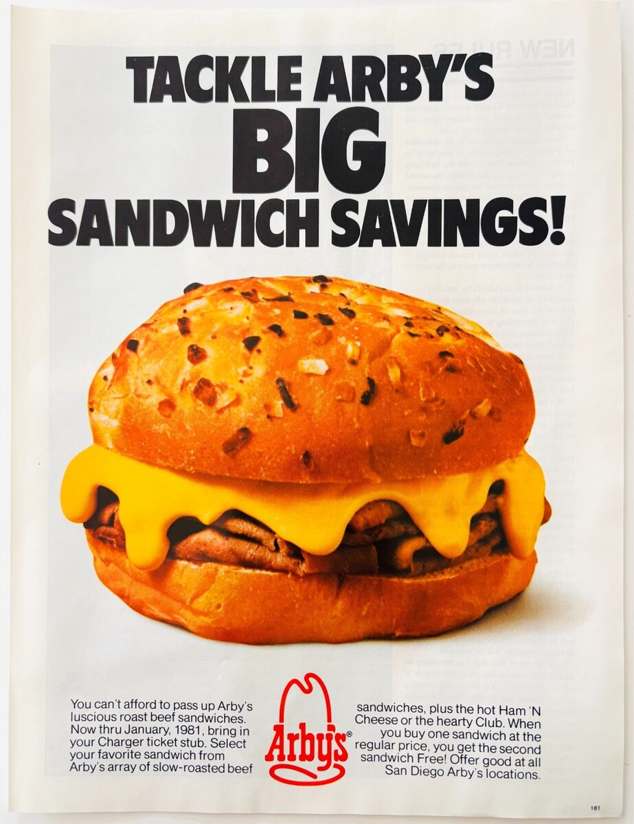 1981 Arby's Roast Beef Restaurant Advertisement San Diego Chargers NFL DWV11A