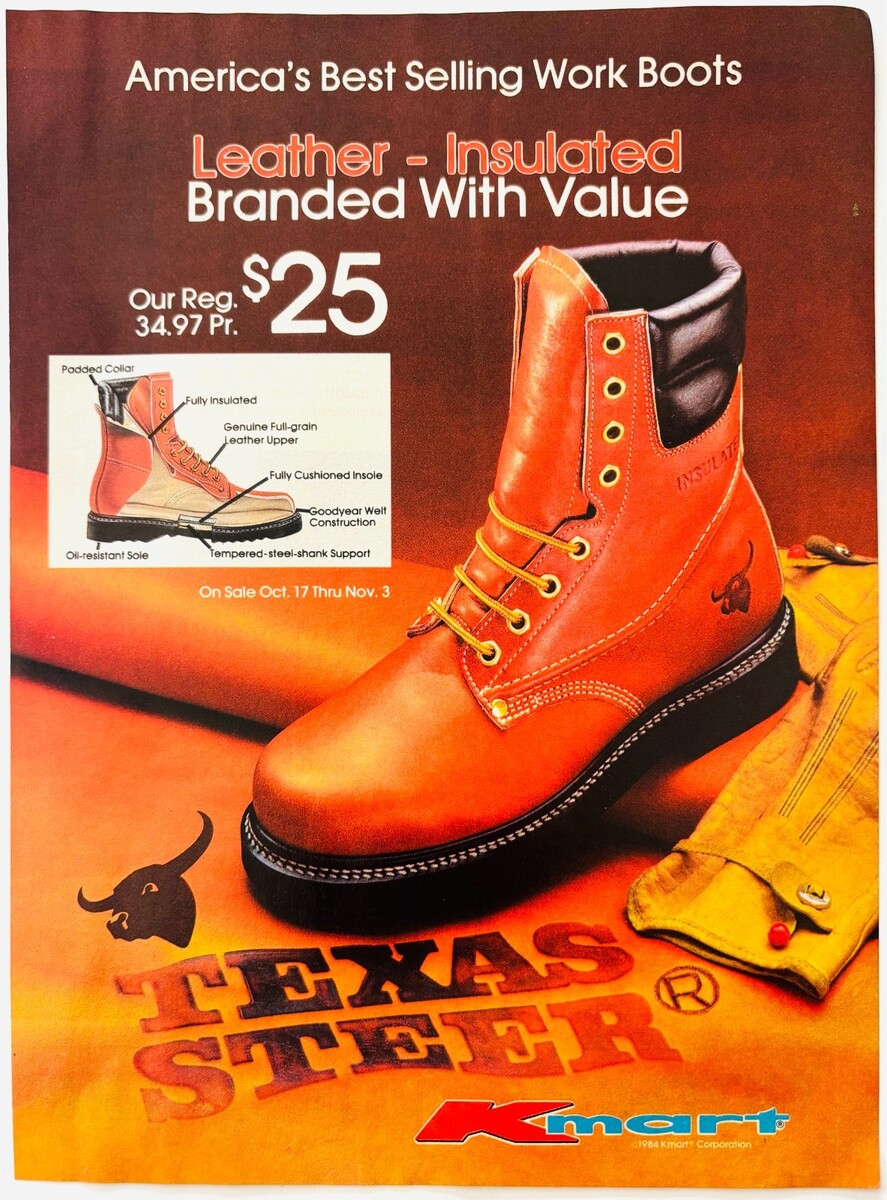 1984 Kmart Texas Steer Work Boots Advertisement Vintage Clothing Leather DWU17F