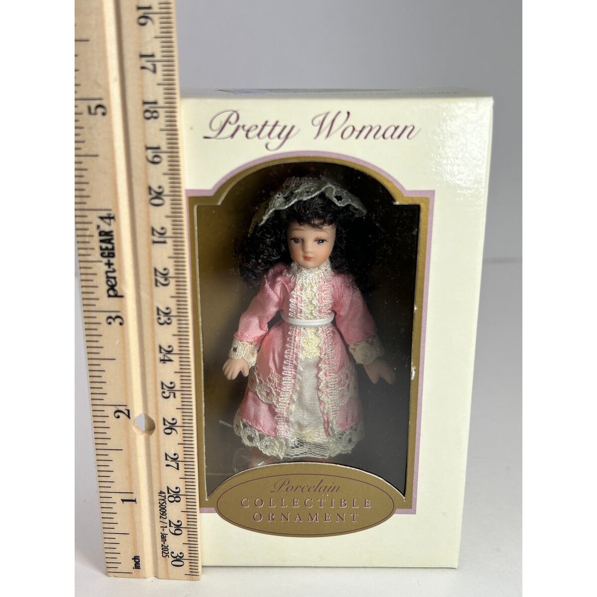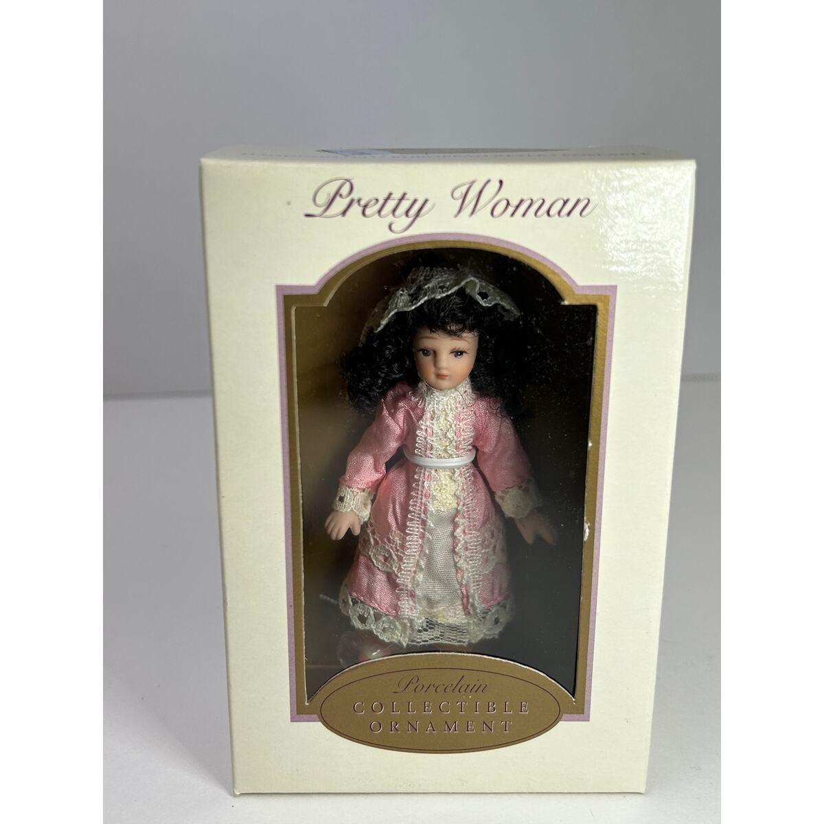Pretty Woman Porcelain Doll Ornament Pink Satin Lace Dress Brunette Curls 2004