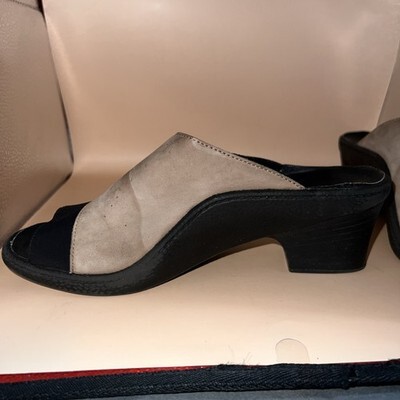 Preowned Romika women?s slide sandals featuring a black and tan color block design with open toes. Known for comfort and support, Romika sandals are crafted for casual everyday wear.