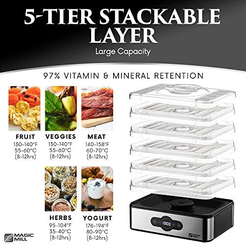 Magic Mill Food Dehydrator Machine 5 Stackable Stainless Steel Trays Jerky Dryer