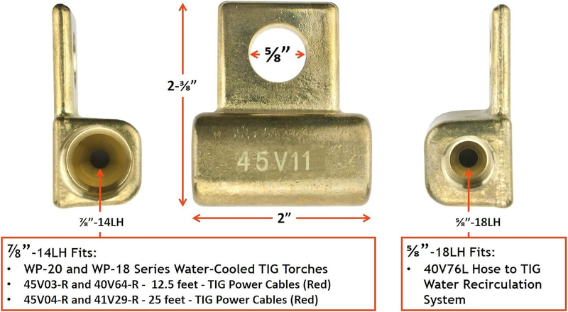 High-quality TIG torch power cable adapter for Air Cooled and Water Cooled WP Series TIG Torches Three models available: 105Z57 for WP-9 and WP-17 TIG Torches, 45V62 for WP-26 TIG Torches and 45V11 for WP-20 and WP-18 TIG Torches Select the size option and check Picture #2 for dimensions and compatible TIG cables and TIG Hoses You will receive 1 (one), Cable Adapter. Select your Model in the Size menu options. The threads in this adaptor are carefully machined for a leak-free connection. Dont buy cheap TIG adapters that will waste your expensive Argon.