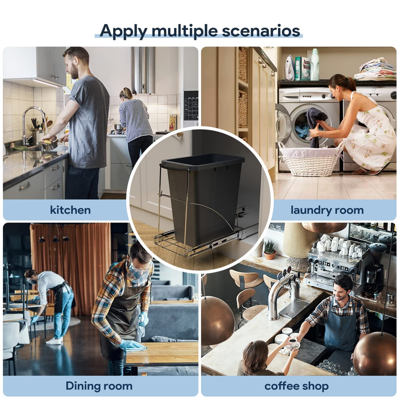 ?MORE POSSIBLE?Pull out trash can under cabinet can be applied to multiple scenarios, household cleaning, garage storage, laundry room storage, restaurant cafe bar counter, etc. Any space that wants to hide storage can be transformed with your hands-on ability.