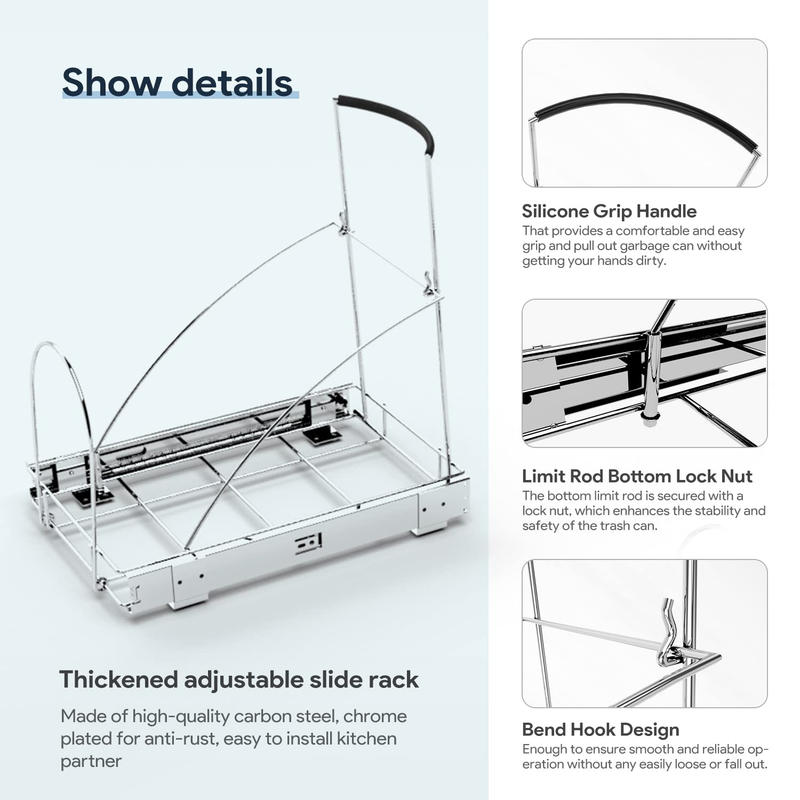 ?Sturdy ?The cabinet trash can pull out kit is made of high-quality heavy-duty steel with a chrome,Using thickened industrial grade solid ball bearing system,Rust and corrosion resistant,The maximum bearing capacity can reach 100 pounds, Note: not Include Garbage Bin.
