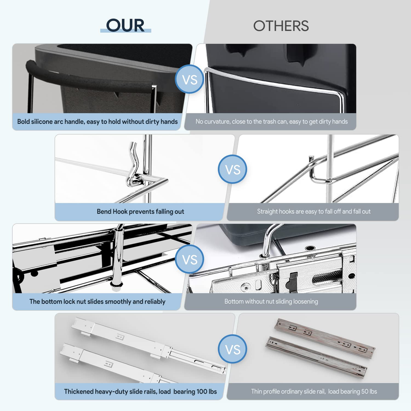 ?HIDDEN DESIGN?Under sink trash can pull out kit Hidden inside the cabinet, It can maximize the space and efficiency of using the kitchen. It upgrades the curved silicone handle to provide an easy-to-grip feel, and it will not dirty your hands when you pull out the trash can.The upgraded Bend hook design is enough to ensure smooth and reliable operation without loosening or falling off easily.