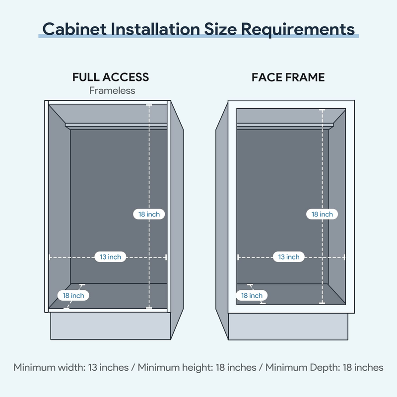 Product dimensions - 16"Dx11"Wx16.5"H, Cabinet opening requirements: width 13", depth 18", height 18". When measuring the cabinet, consider obstacles such as hinges, and the height is determined by the trash can you use.