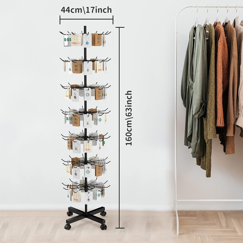 [Non-slip Design]: Each Spinning Display Stand Rack contains 7 layers of hooks, and each layer contains 10 hooks, which is convenient for you to classify items. The base consists of an iron cross with wheels. We have made a special anti-slip design on the wheels to ensure that it is not accidentally pushed away