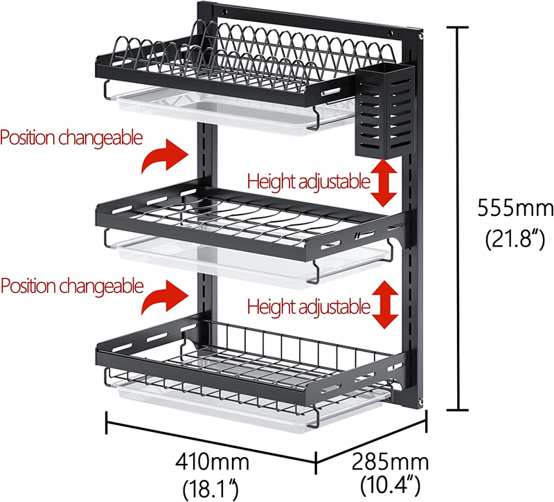 ?Detachable Adjustable Layer?Each Layer of this 3-tier dish rack could be detachable and height adjustable, thus you could set the dish rack, bowl rack and fruit vegetable basket in a reasonable position based on the height of your items. Storage various kitchen suppliers on this dish drainer shelf to save your countertop space