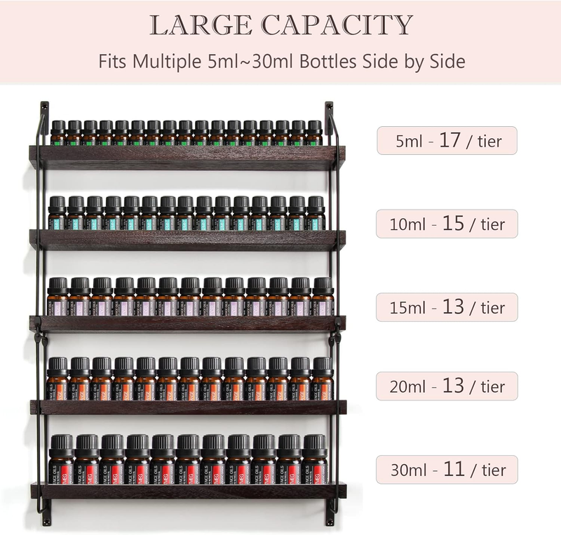 Large Storage Capacity: Our wall-mount essential oil organizer can store multiple 5/10/15/20/30 ml EO bottles. The large capacity shelves can hold 11-17 bottles on each tier, and the 5 tiers can hold 55-85 bottles in total (actual number may vary by size and shape)