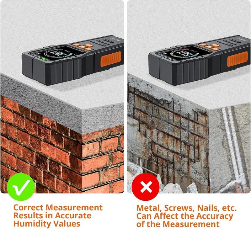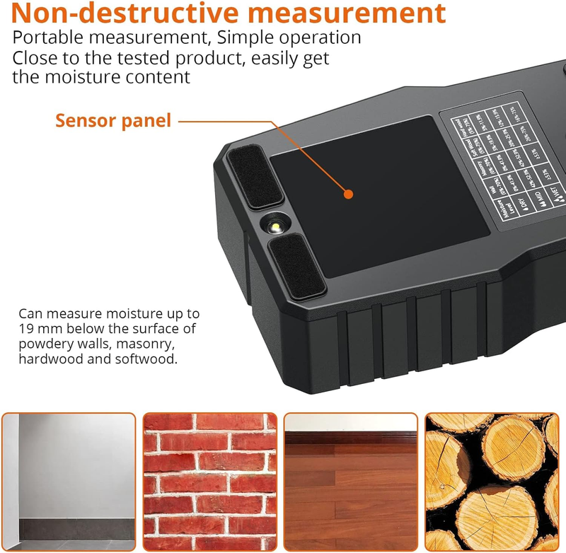 PINLESS NON-INVASIVE WOOD MOISTURE METER: Protect Work Surface - Pinless moisture meter allows for non destructive detection of moisture content of hardwood, softwood or building materials (like drywall and masonry). No pinhole design, well used for carpentry, water leakage repair, building construction and home decoration