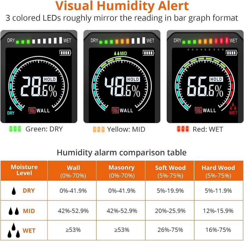 FULL FEATURE FOR MOSITURE DETECT: Easy to Read Use - Moisture meter has big backlit LCD screen and a 3-color LED bar graph, HOLD button, auto power-off, bright reverse-contrast display; out of range alarm and low battery