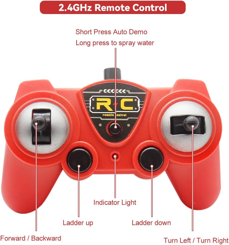 9 CH Fully Functional Toys: This remote control fire truck toy can go forward/backward and turn right/left. The fire truck comes with LED lights and a rescue ladder that extends and sprays water. Ladder console can be manually rotated 350 very interesting. This car is beautifully designed and loved by kids, a great birthday gift for kids