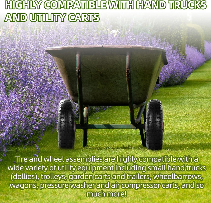 HIGHLY COMPATIBLE WITH HAND TRUCKS AND UTILITY CARTS - These tire and wheel assemblies are highly compatible with a wide variety of utility equipment including small hand trucks (dollies), trolleys, garden carts and trailers, wheelbarrows, wagons, pressure washer and air compressor carts, and so much more!