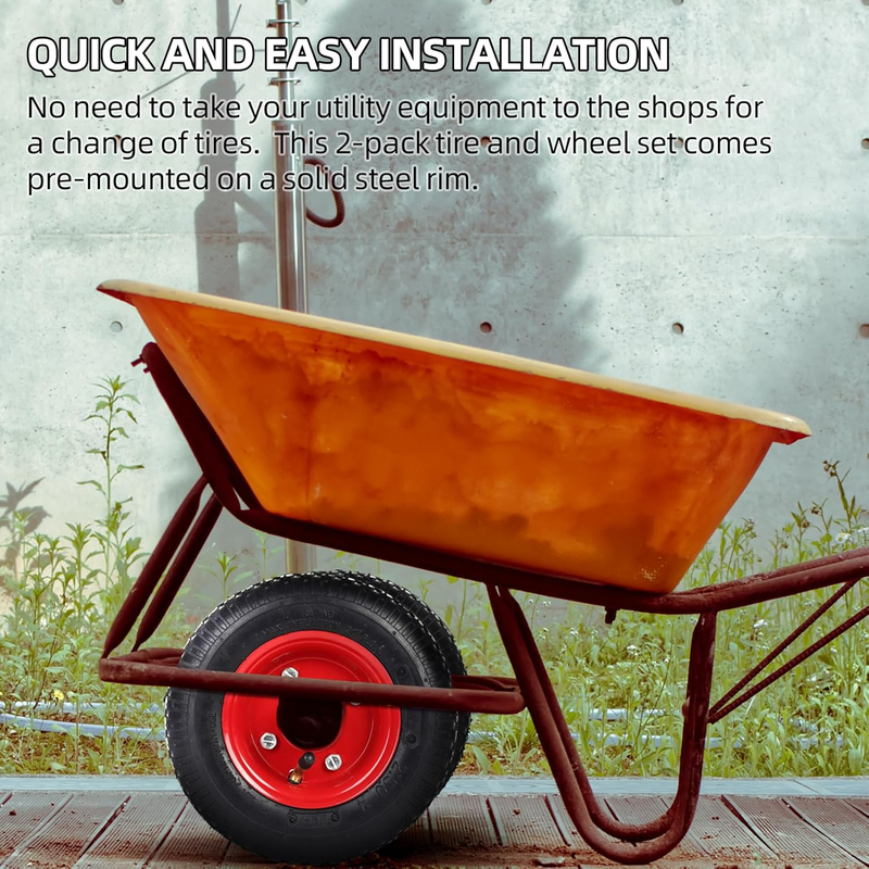QUICK AND EASY INSTALLATION - There's no need to take your utility equipment to the shops for a change of tires. This 2-pack tire and wheel set comes pre-mounted on a solid steel rim. All that's required is for you to install the wheel assembly on your utility equipment and you're good to go.