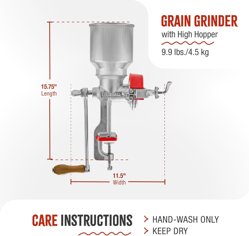 MANUAL MILLING MACHINE: This grain mill has a durable cast-iron hand crank with a wooden handle and high-performance white iron discs for grinding all types of grain. Simply adjust the screw to change the coarseness and fineness of your milling.