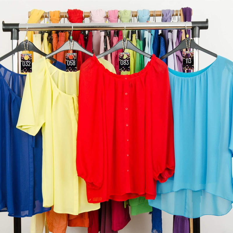 Proper size: live plastic tag is 1.5 x 2.5 inch, and has a 0.5 inch hanger hole and thickness of 0.05 cm/ 0.02 inch, and all 4 corners are rounded, won't hurt your hand or anything, and fit well to show the audience the number code of the item being sold